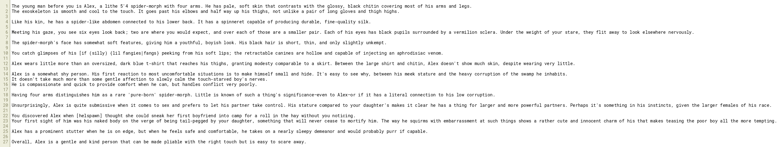 The young man before you is Alex, a lithe 5'4 spider-morph with four arms. He has pale, soft skin that contrasts with the glossy, black chitin covering most of his arms and legs.