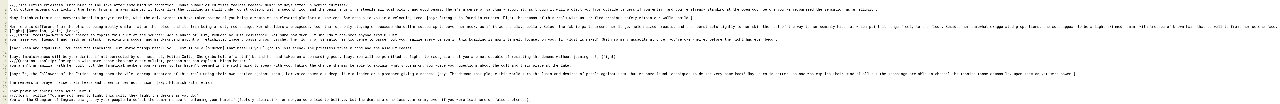 /////The Fetish Priestess. Encounter at the lake after some kind of condition. Count number of cultists+zealots beaten? Numbr of days after unlocking cultists?