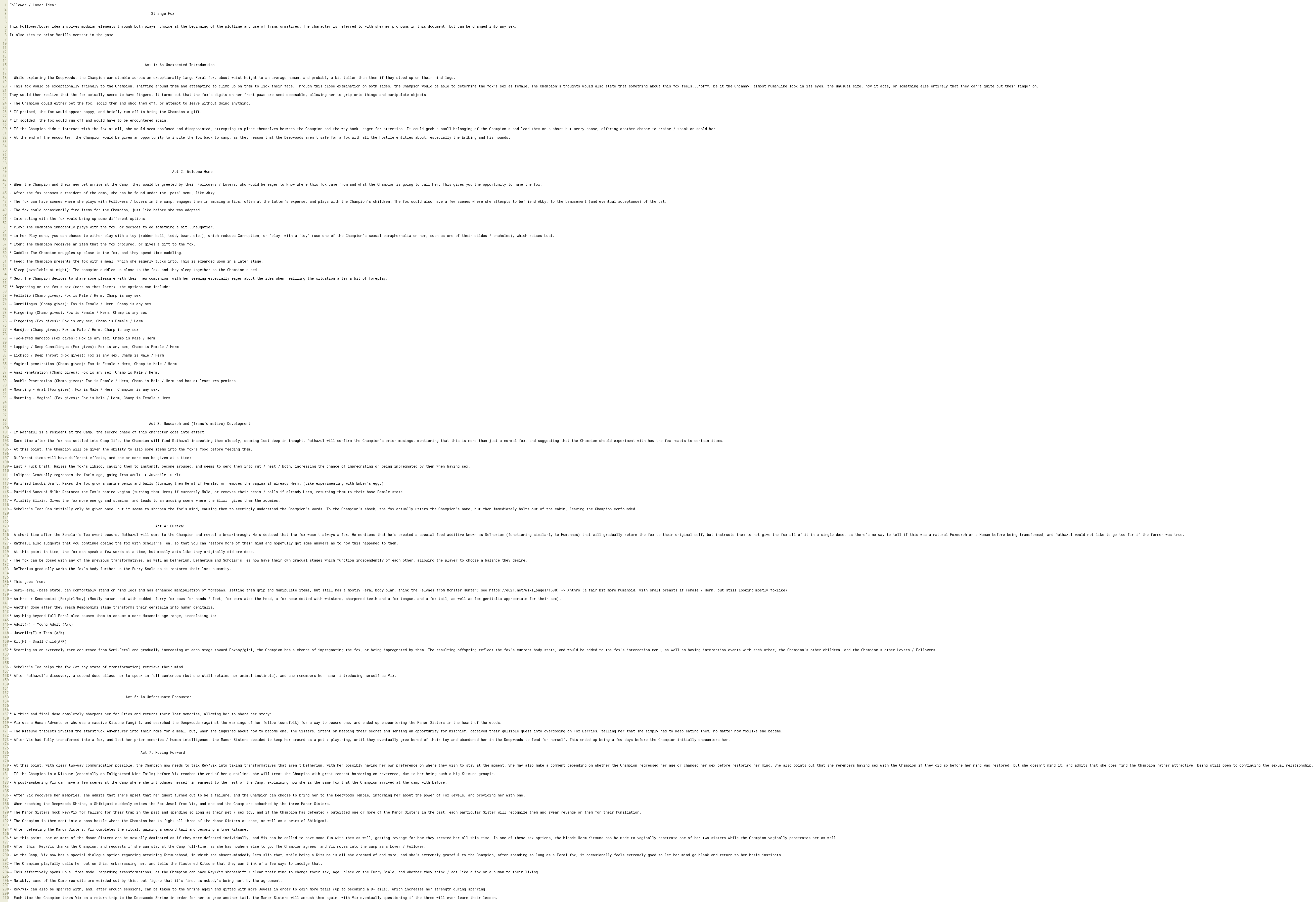 * Starting as an extremely rare occurence from Semi-Feral and gradually increasing at each stage toward Foxboy/girl, the Champion has a chance of impregnating the fox, or being impregnated by them. The resulting offspring reflect the fox's current body state, and would be added to the fox's interaction menu, as well as having interaction events with each other, the Champion's other children, and the Champion's other Lovers / Followers.