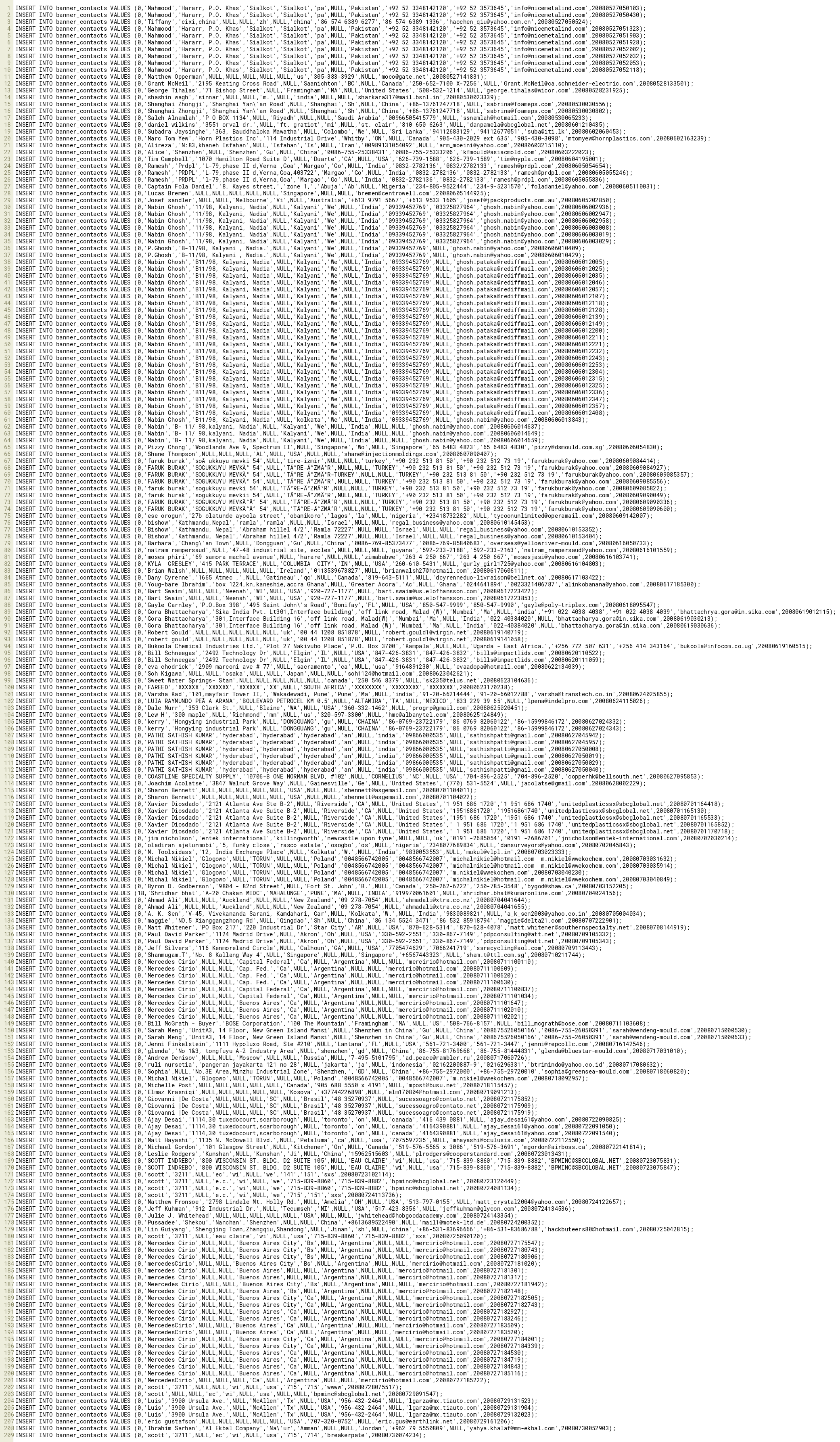 INSERT INTO banner_contacts VALUES (0,'glenda','No 1&3, tongfuyu A-2 Industry Area',NULL,'shenzhen','gd',NULL,'China','86-755-81769668','86-755-81444831','glenda@bluestar-mould.com',20080717031010);