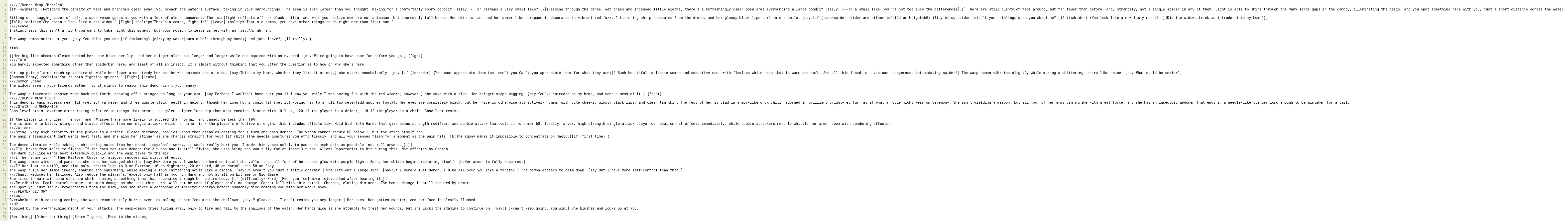 The wasp's insectoid abdomen wags back and forth, showing off a stinger as long as your arm. [say:Perhaps I wouldn't have hurt you if I saw you while I was having fun with the red widows; however,] she says with a sigh. Her stinger stops wagging. [say:You've intruded on my home, and made a mess of it.] {fight}