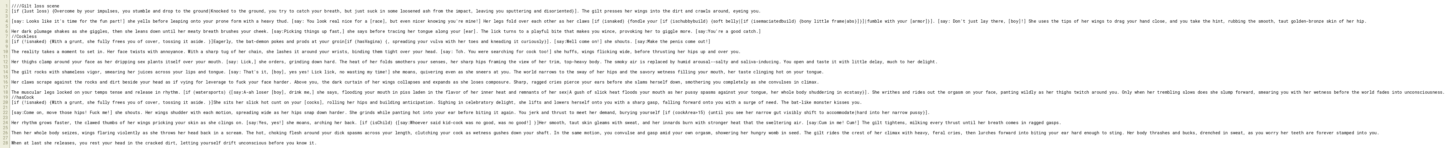 Her rhythm grows faster, the clawed thumbs of her wings pricking your skin as she clings on. [say:Yes, yes!] she moans, arching her back. [if (isChild) {[say:Whoever said kid-cock was no good, was no good!] }]Her smooth, taut skin gleams with sweat, and her innards burn with stronger heat that the sweltering air. [say:Cum in me! Cum!] The gilt tightens, milking every thrust until her breath comes in ragged gasps.