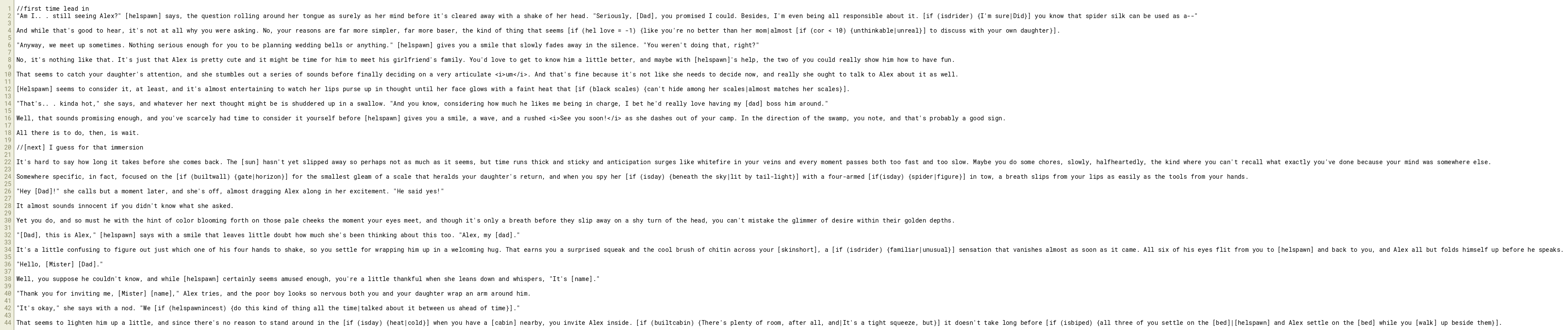 Somewhere specific, in fact, focused on the [if (builtwall) {gate|horizon}] for the smallest gleam of a scale that heralds your daughter's return, and when you spy her [if (isday) {beneath the sky|lit by tail-light}] with a four-armed [if(isday) {spider|figure}] in tow, a breath slips from your lips as easily as the tools from your hands.