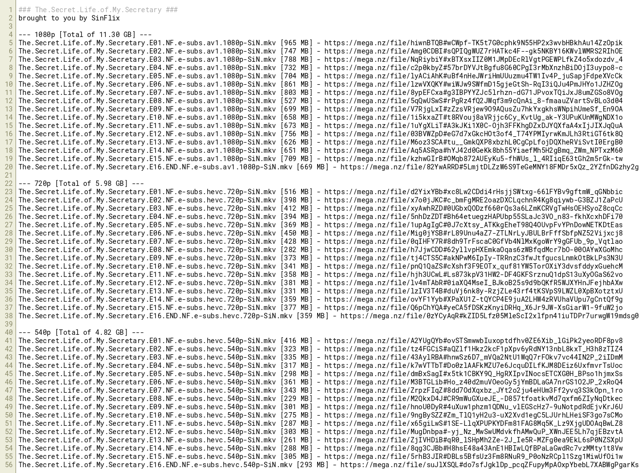 The.Secret.Life.of.My.Secretary.E12.NF.e-subs.hevc.540p-SiN.mkv [303 MB] - https://mega.nz/file/MugDnbpa#-yj_Nz_MwSwUMdvkfhAMwQuP_XWnJEE5Lh7qjEBzvtA