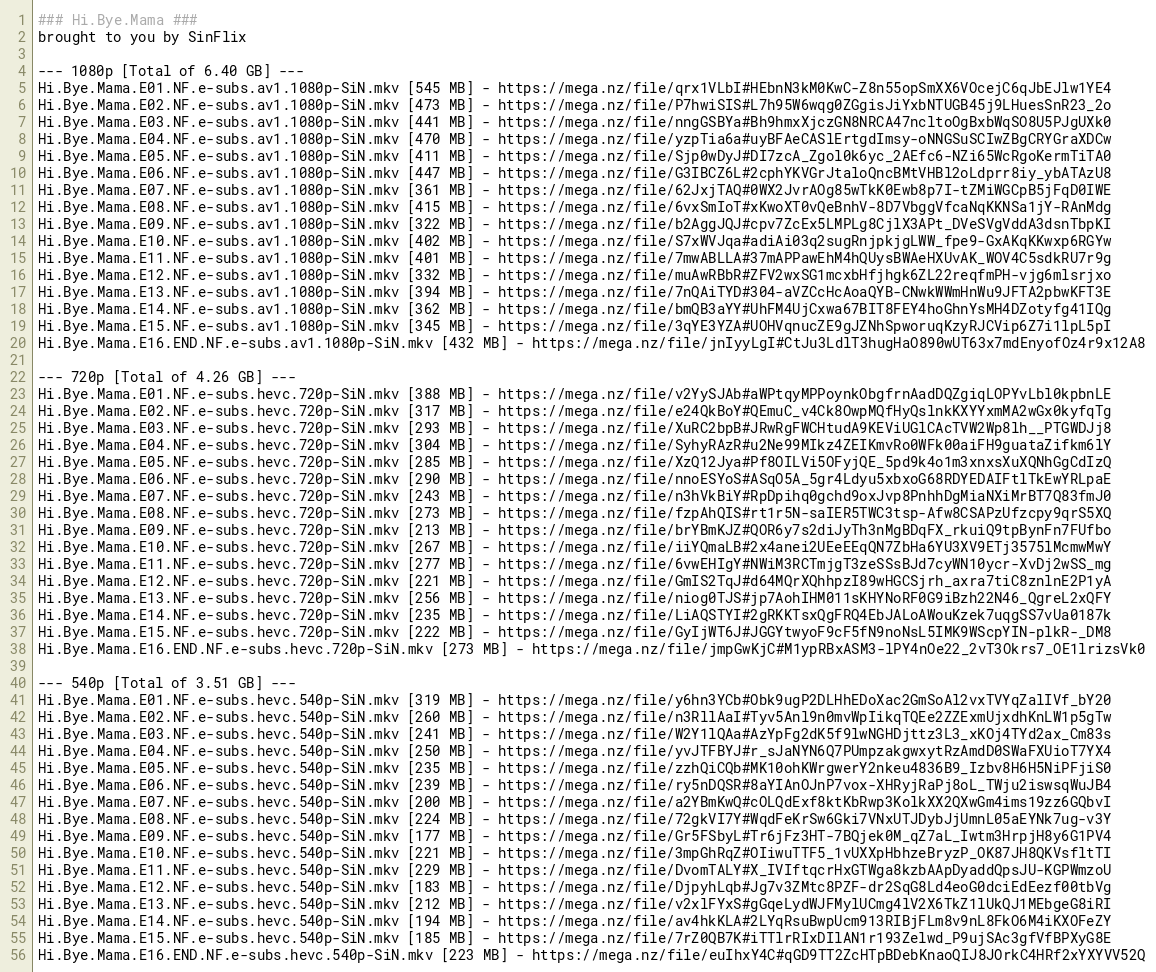 Hi.Bye.Mama.E16.END.NF.e-subs.hevc.540p-SiN.mkv [223 MB] - https://mega.nz/file/euIhxY4C#qGD9TT2ZcHTpBDebKnaoQIJ8JOrkC4HRf2xYXYVV52Q