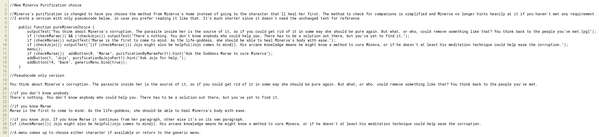 //Minerva's purification is changed to have you choose the method from Minerva's home instead of going to the character that'll heal her first. The method to check for companions is simplified and Minerva no longer hints heavily at it if you haven't met any requirement
