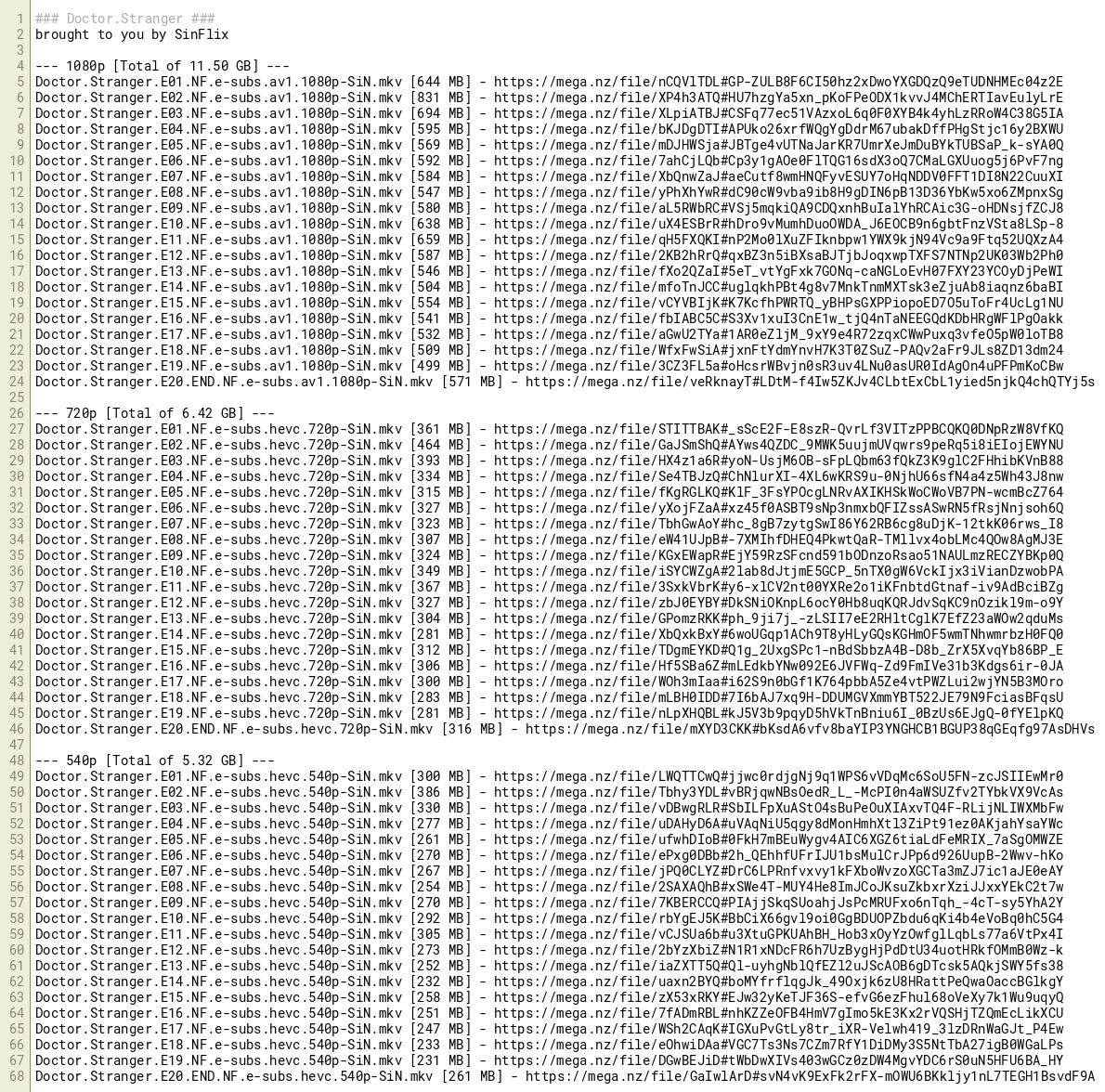 Doctor.Stranger.E18.NF.e-subs.hevc.540p-SiN.mkv [233 MB] - https://mega.nz/file/eOhwiDAa#VGC7Ts3Ns7CZm7RfY1DiDMy3S5NtTbA27igB0WGaLPs