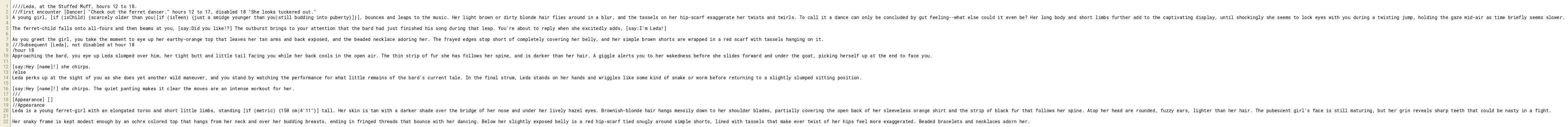 Leda is a young ferret-girl with an elongated torso and short little limbs, standing [if (metric) {150 cm|4'11"}] tall. Her skin is tan with a darker shade over the bridge of her nose and under her lively hazel eyes. Brownish-blonde hair hangs messily down to her shoulder blades, partially covering the open back of her sleeveless orange shirt and the strip of black fur that follows her spine. Atop her head are rounded, fuzzy ears, lighter than her hair. The pubescent girl's face is still maturing, but her grin reveals sharp teeth that could be nasty in a fight.