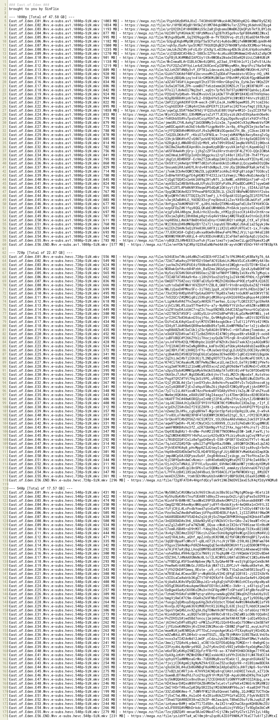East.of.Eden.E51.Wvv.e-subs.av1.1080p-SiN.mkv [760 MB] - https://mega.nz/file/WjIXUbiD#8dMKRpOD1TZs7l1JopybS7BhxWpCJSAuEia25gykj0w