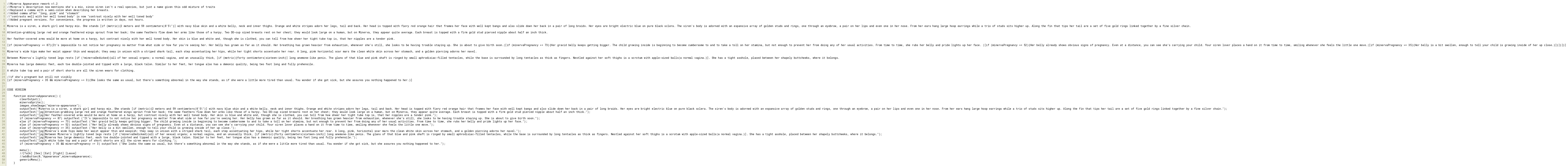 [if (minervaPregnancy >= 87){It’s impossible to not notice her pregnancy no matter from what side or how far you’re seeing her. Her belly has grown as far as it should. Her breathing has grown heavier from exhaustion, whenever she’s still, she looks to be having trouble staying up. She is about to give birth soon.|[if (minervaPregnancy >= 73){Her gravid belly keeps getting bigger. The child growing inside is beginning to become cumbersome to and to take a toll on her stamina, but not enough to prevent her from doing any of her usual activities. From time to time, she rubs her belly and pride lights up her face. |[if (minervaPregnancy >= 52){Her belly already shows obvious signs of pregnancy. Even at a distance, you can see she’s carrying your child. Your siren lover places a hand on it from time to time, smiling whenever she feels the little one move.|[if (minervaPregnancy >= 35){Her belly is a bit swollen, enough to tell your child is growing inside of her up close.}]}]}]}]