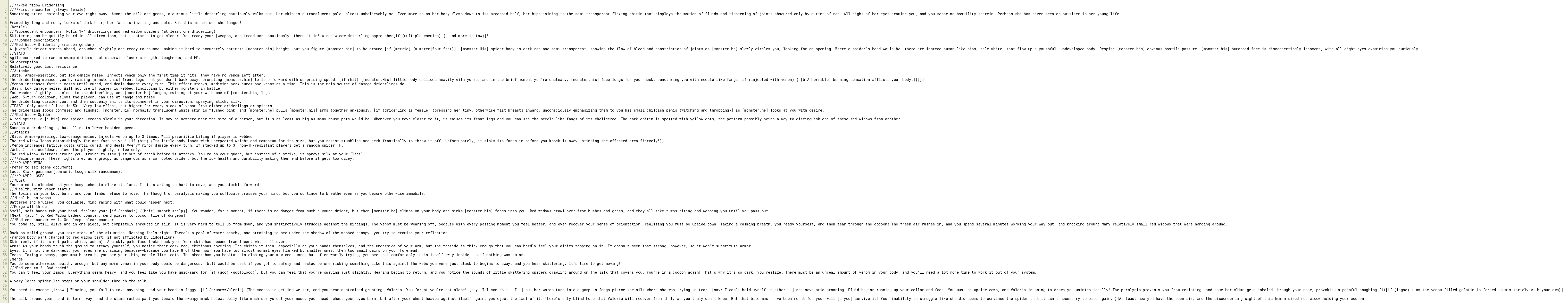 Skittering can be quietly heard in all directions, but it starts to get closer. You ready your [weapon] and tread more cautiously--there it is! A red widow driderling approaches[if (multiple enemies) {, and more in tow}]!