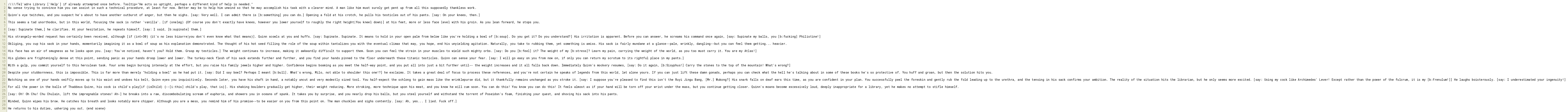 His face has an air of smugness as he looks upon you. [say: You've noticed, haven't you? Hold them. Grasp my testicles.] The weight continues to increase, making it awkwardly difficult to support them. Soon you can feel the strain in your muscles to wield such mighty orbs. [say: Do you [b:feel] it? The weight of my [b:stress]? Learn my pain, carrying the weight of the world, as you too must carry it. You are my Atlas!]