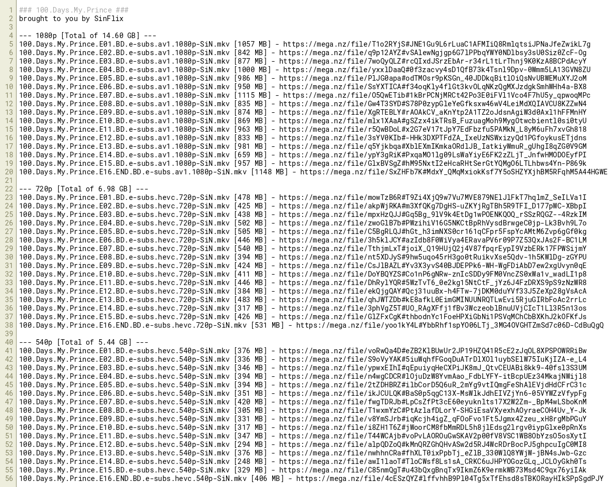 100.Days.My.Prince.E12.BD.e-subs.av1.1080p-SiN.mkv [833 MB] - https://mega.nz/file/3sYV0KIb#-HHk3DXPTFdZA_IxeUzNSWxizyQd1PGfoykusETjdns