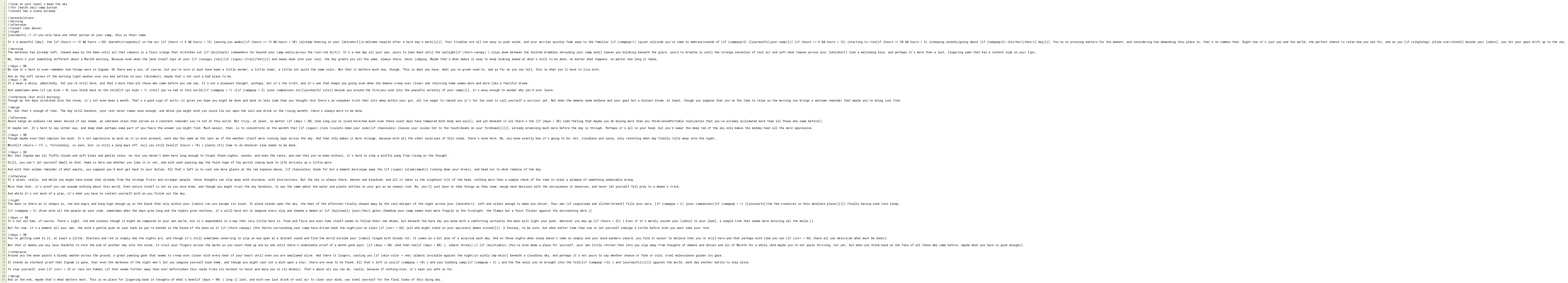 You're getting used to it, at least a little. Starless and red is simply how the nights are, and though it's still sometimes unnerving to slip an eye open at a distant sound and find the world outside your [cabin] tinged with bloody rot, it comes as a bit less of a surprise each day. And on those nights when sleep doesn't come so simply and your mind wanders inward, you find it easier to believe that you're still here and that perhaps with time you can [if (corr > 66) {have all you desire|do what must be done}].