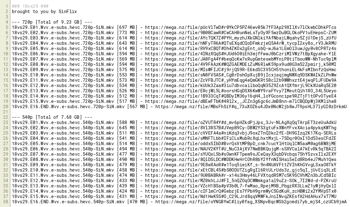 18vs29.E01.Wvv.e-subs.hevc.720p-SiN.mkv [697 MB] - https://mega.nz/file/pUcVlTwD#r0YkCP5PZ46wv05k7fF3Ap29XIlXv7lCkwbCDhkPTcs
