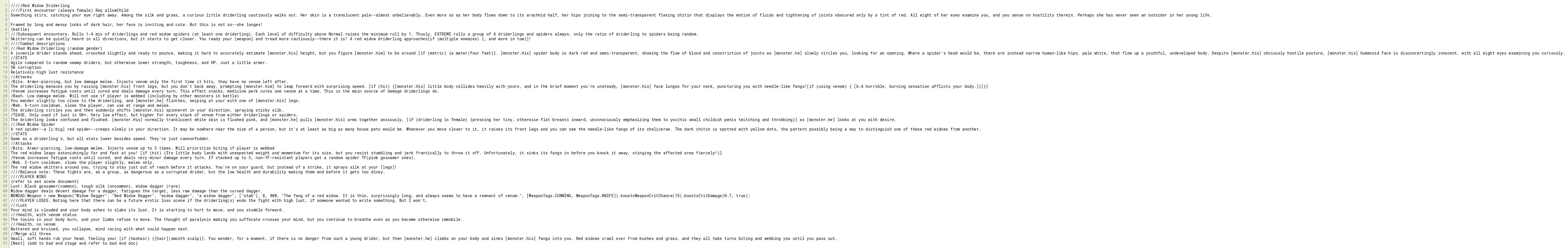 Skittering can be quietly heard in all directions, but it starts to get closer. You ready your [weapon] and tread more cautiously--there it is! A red widow driderling approaches[if (multiple enemies) {, and more in tow}]!
