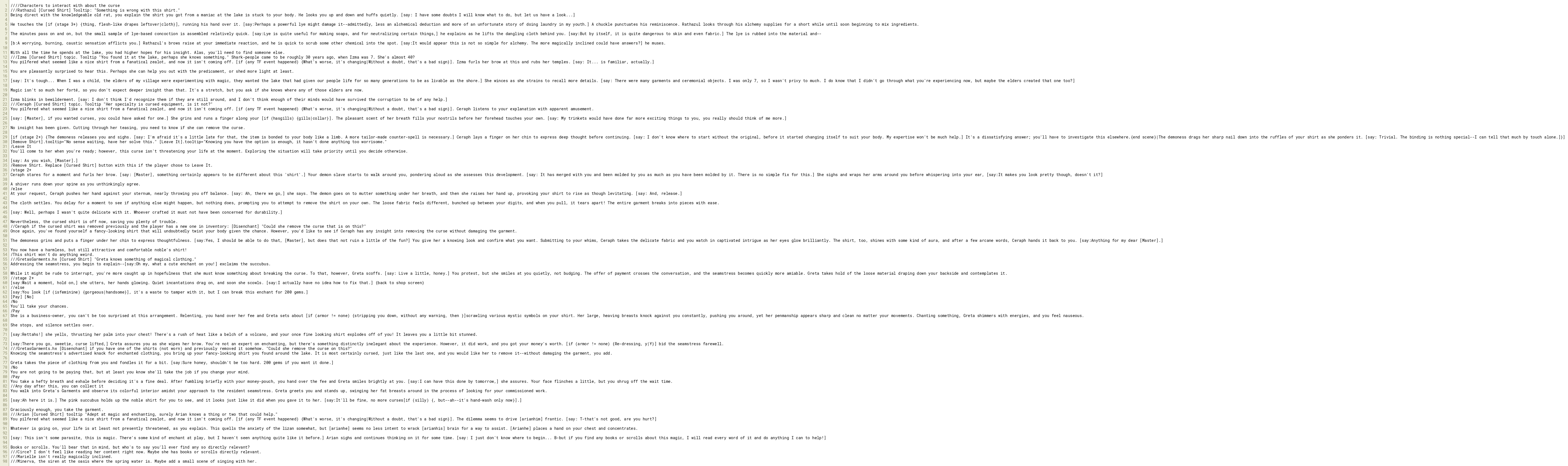 Knowing the seamstress's advertised knack for enchanted clothing, you bring up your fancy-looking shirt you found around the lake. It is most certainly cursed, just like the last one, and you would like her to remove it--without damaging the garment, you add.
