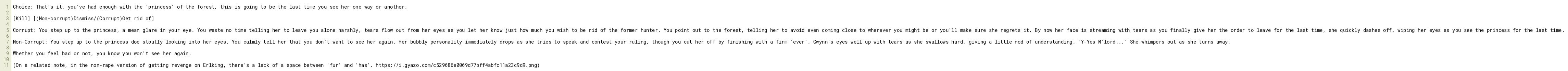 Non-Corrupt: You step up to the princess doe stoutly looking into her eyes. You calmly tell her that you don't want to see her again. Her bubbly personality immediately drops as she tries to speak and contest your ruling, though you cut her off by finishing with a firm 'ever'. Gwynn's eyes well up with tears as she swallows hard, giving a little nod of understanding. "Y-Yes M'lord..." She whimpers out as she turns away.