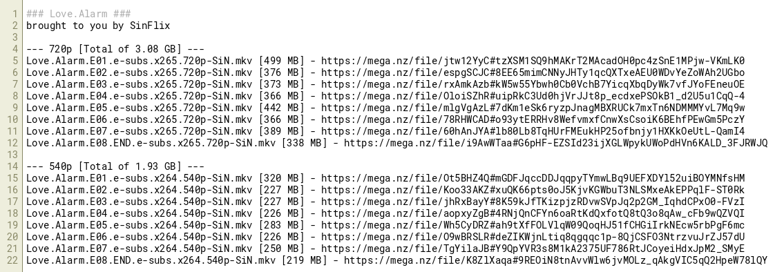 Love.Alarm.E08.END.e-subs.x264.540p-SiN.mkv [219 MB] - https://mega.nz/file/K8ZlXaqa#9REOiN8tnAvvWlw6jvMOLz_qAkgVIC5qQ2HpeW78lQY