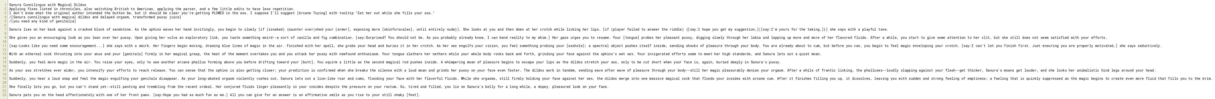 As your ass stretches ever wider, you intensify your efforts to reach release. You can sense that the sphinx is also getting closer; your prediction is confirmed when she breaks the silence with a loud moan and grinds her pussy on your face even faster. The dildos work in tandem, sending wave after wave of pleasure through your body--still her magic pleasurably denies your orgasm. After a while of frantic licking, the phalluses--loudly slapping against your flesh--get thicker, Sanura's moans get louder, and she locks her animalistic hind legs around your head.
